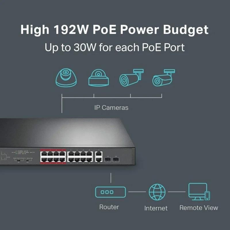 - Switch PoE + de 16 puertos dedicado (presupuesto de 250 W) para numerosas aplicaciones: El cumplimiento del estándar 802.3af / at PoE + admite hasta 30 W en cada puerto PoE. El presupuesto total de energía PoE de 250 W * para los 16 puertos PoE + hace que tenga una amplia gama de aplicaciones, como vigilancia, oficinas, dormitorios y pequeñas empresas. Es totalmente compatible con cámaras IP, puntos de acceso, teléfonos IP, computadoras, impresoras, etc.
