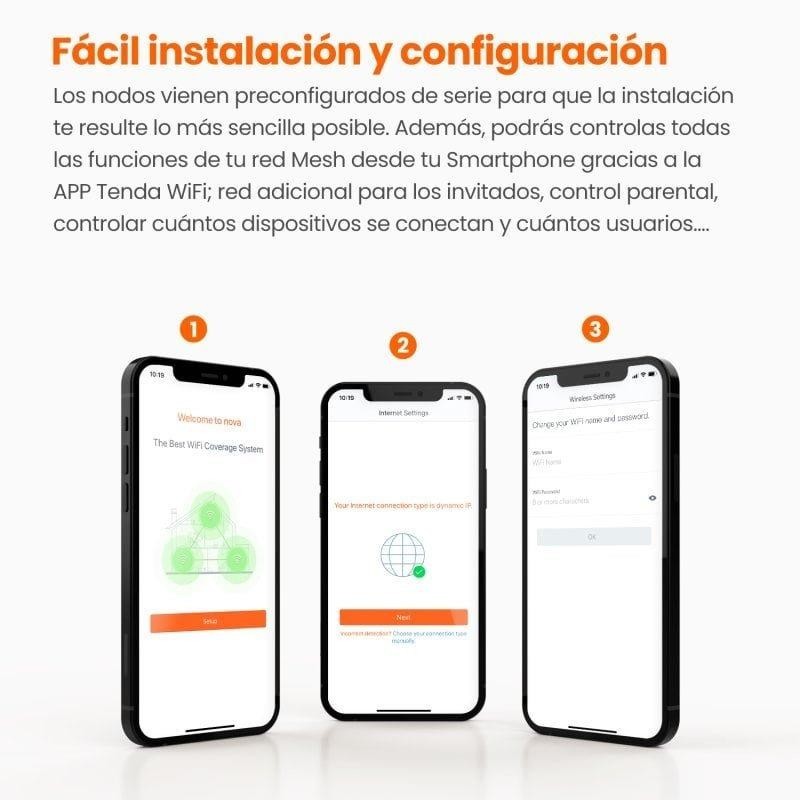• Ve lo que está pasando con la App Wi-Fi Tenda: Mantén todo bajo control. Puedes controlar tu nova mientras estás fuera utilizando la App Tenda Wi-Fi. La aplicación te ayuda a personalizar y administrar tu red, como el acceso de los usuarios y controles parentales.