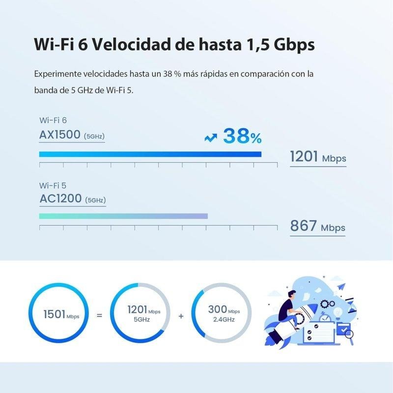 • AX1500 Mesh Wi-Fi 6: la velocidad puede alcanzar 1501 Mbps (5 GHz: 1201 Mbps 2,4 GHz: 300 Mbps), un 38 % más rápido que el AC1200.