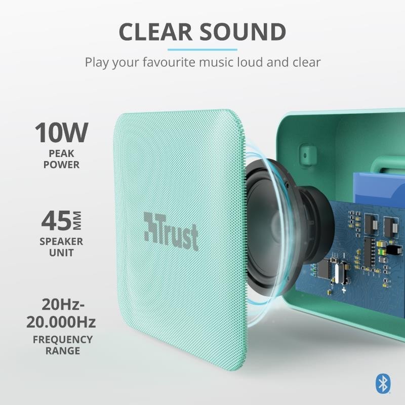 Lleva la música adonde quiera que vayas. El Zowy de Trust es un altavoz Bluetooth elegante y compacto que hará una fiesta de cualquier excursión, salida a la piscina o vacaciones. Es suficientemente pequeño para transportarlo cuando se está de viaje, es impermeable, tiene una batería que dura hasta 12 horas y un radiador pasivo de graves para dar un poco más de potencia a la música.