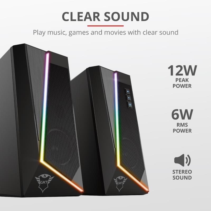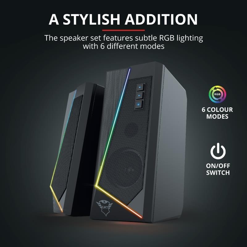 Gracias a su diseño estilizado y a la sutil iluminación RGB, el juego de auriculares GXT 609 Zoxa de Trust es un complemento elegante para cualquier escritorio. Además, este juego de altavoces estéreo es fácil de usar y ni siquiera requiere un enchufe de pared. Se enciende automáticamente al encender el PC.