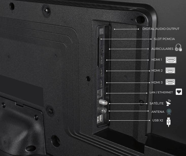 • Puertos: 3× HDMI, 2× USB (PVR ready), salida óptica, toma para auriculares