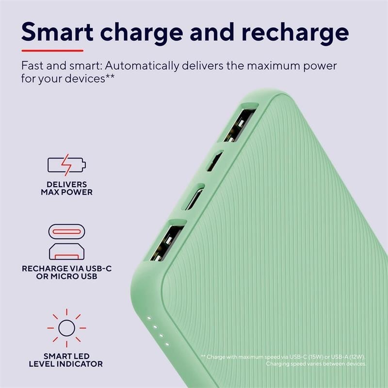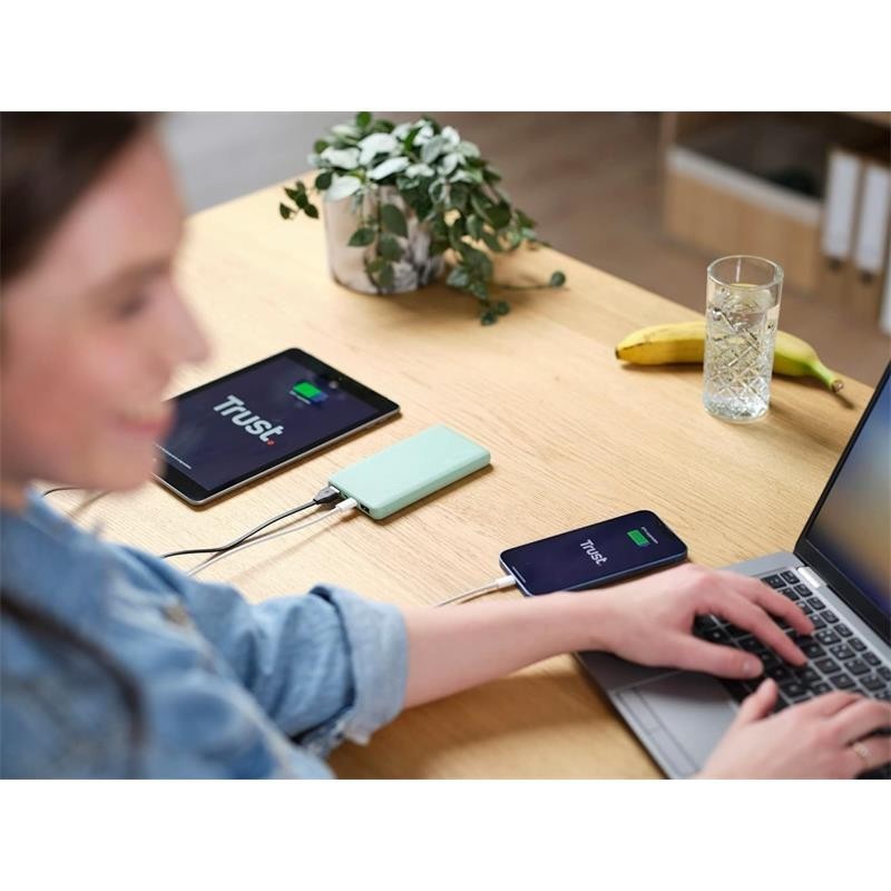 La batería externa Trust Primo de 10 000 mAh es rápida e inteligente: ofrece automáticamente la potencia máxima para los dispositivos**. Además, la batería externa se puede recargar rápidamente con el cable micro-USB incluido o a través del puerto USB-C. El indicador de nivel LED inteligente de la batería externa permite saber cuándo es el momento de recargar.