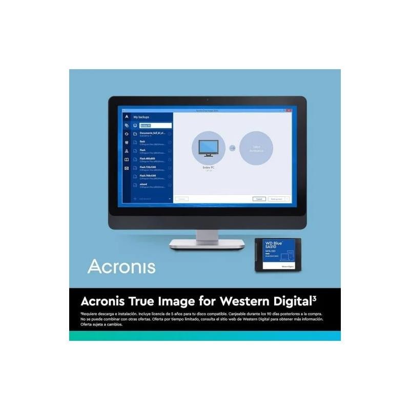 • Proteja su contenido: Puede clonar el disco duro completo de su computadora en la unidad WD Blue SA510 con el software Acronis True Image for Western Digital que incluye. Este software eficiente y fácil de usar también ayuda a proporcionar protección basada en inteligencia artificial para defenderlo de los ataques de ransomware y muchos otros ataques.